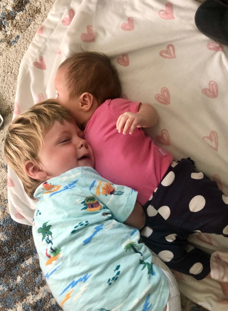 Lilah is now 21 months old and Noah is 3 years 8 months old. The sad truth is that Noah has very little interest in his sister. At best, he tolerates her in his space. If Lilah is around, he will often go into another room and play alone to avoid the interaction. There are certain routines that Lilah and Noah do together-swings, ride in the wagon, go to the park/outings and he does well with those activities because it does not require him to directly interact or share toys. Noah will play next to Lilah but not with Lilah. Lilah at 21 months old is already surpassing Noah in her social development and communication. While Noah wants nothing to do with Lilah, Lilah wants everything to do with Noah. She always tries to play with Noah and never gives up even though he consistently ignores her. We encourage Noah to do small gestures such as giving Lilah a high five or saying, “thank you” when she hands him a toy (all of this requires parent prompting). While she is the little sister, Lilah is already taking on the big sister role in many ways. If Noah is sad, she will pat his hair and his back to try and make him feel better. At bedtime, she loves to wash Noah in the bath, comb his hair, hand him his beloved Wubs and get his pajamas and socks out for him.